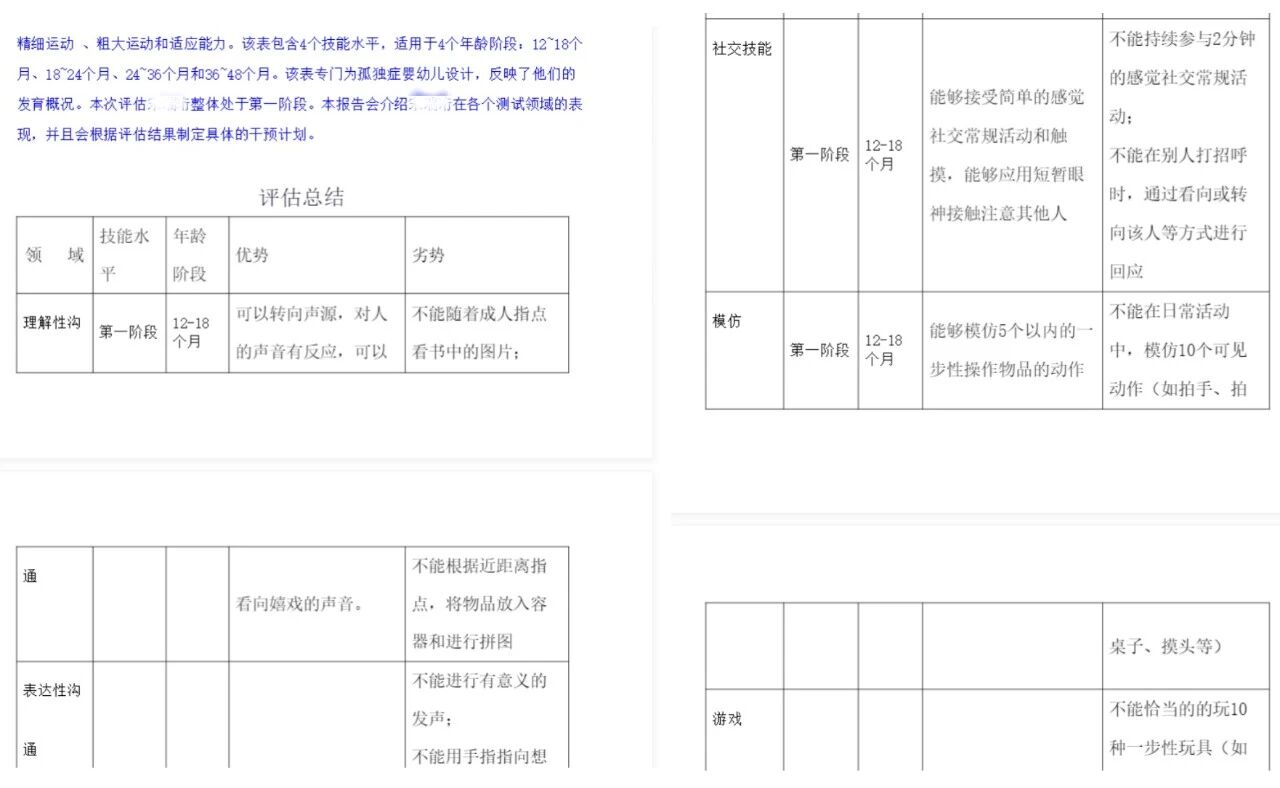 通过ABA评估,童童整体发育处于第二阶段。目前的能力情况为:能转向声源、对人声有反应;可以接受简单感觉社交常规与触摸,有短暂眼神接触;能模仿5个以内一步性操作物品的动作;对环境适应性较好,有较多无意识发音,对强化物动机明显。