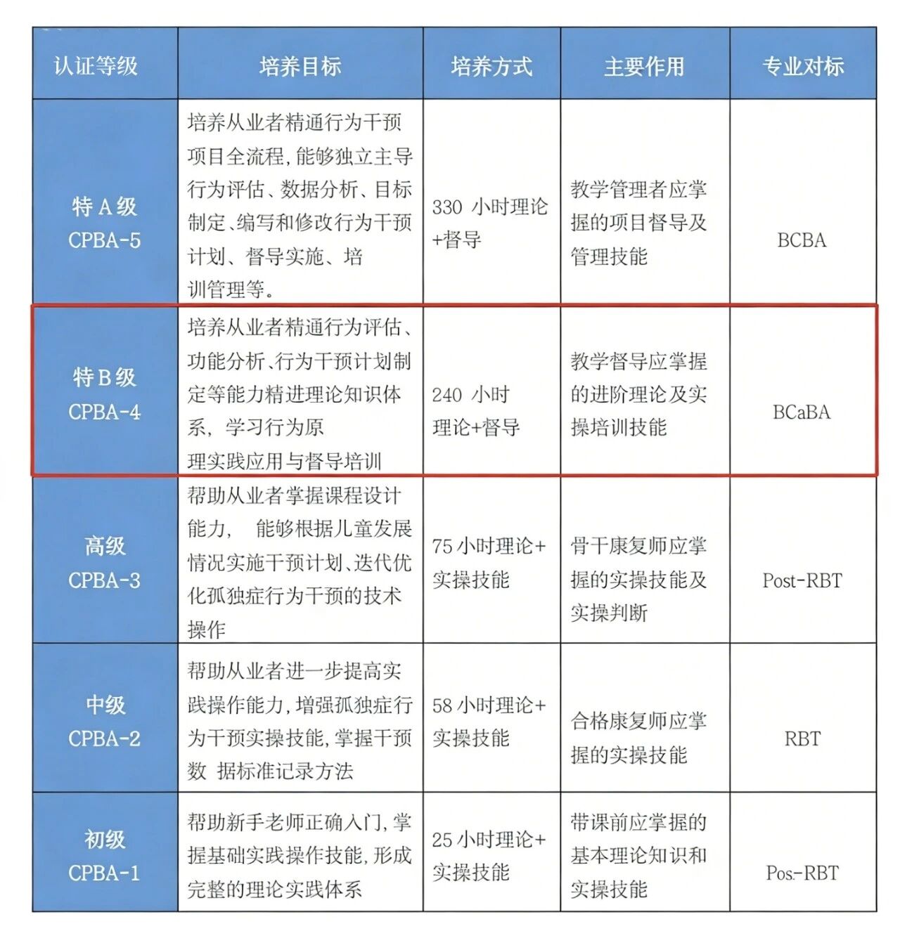 儿童心理行为干预技能认证(CPBA),是中国心理卫生协会推出的针对特殊儿童干预的专业技能认证。课程对标国际 BCBA/BCaBA 标准,结合中国国情构建完整康复教育能力体系。其中CPBA-4 对标国际 BCaBA,课程体系严谨、考核严格,是特教教师专业能力的 “黄金认证”。
